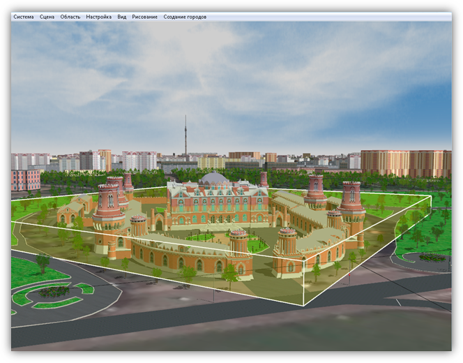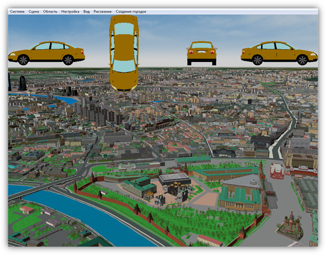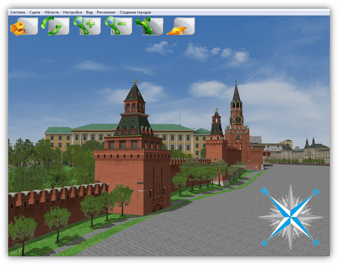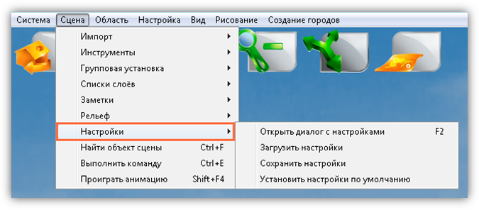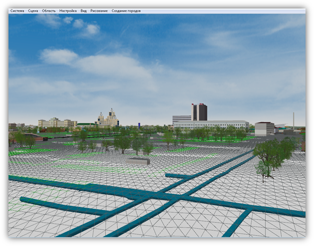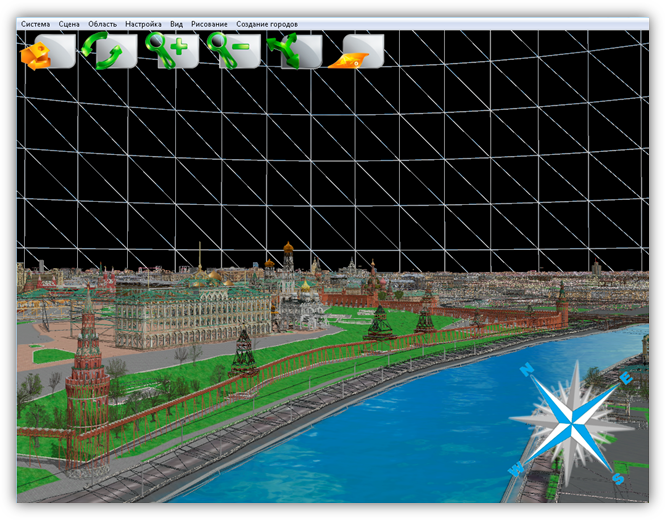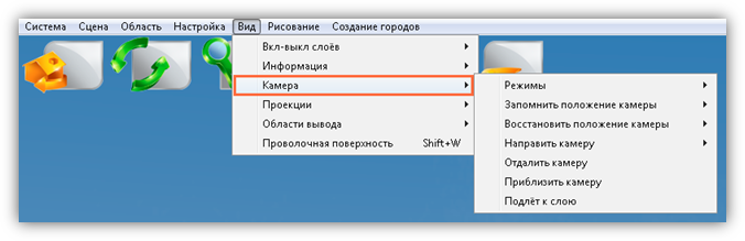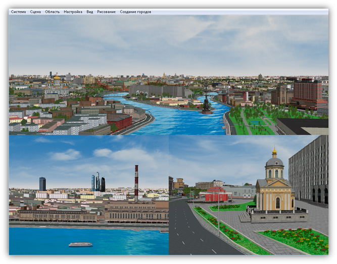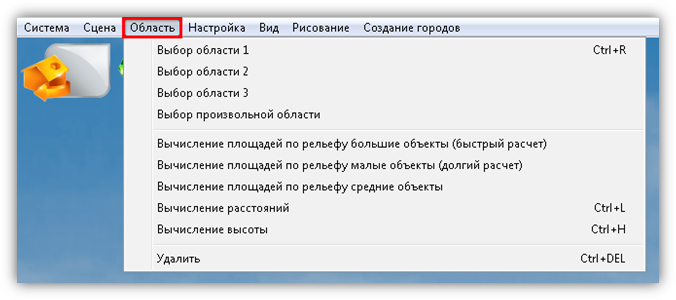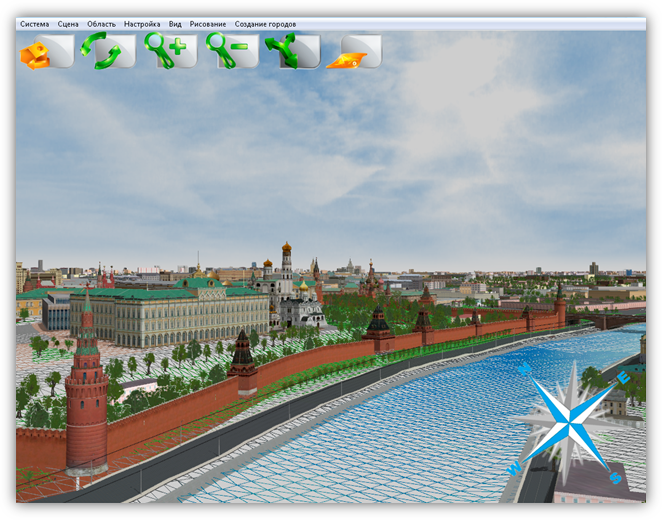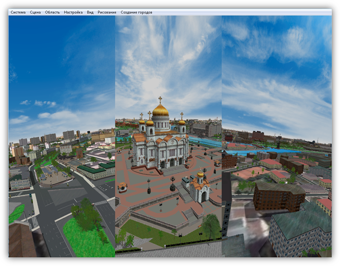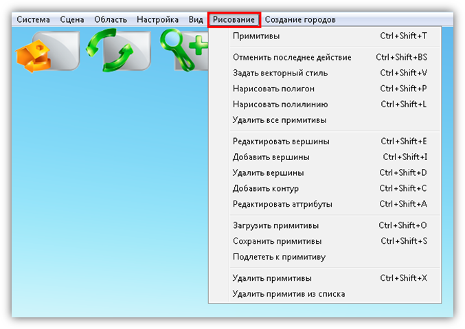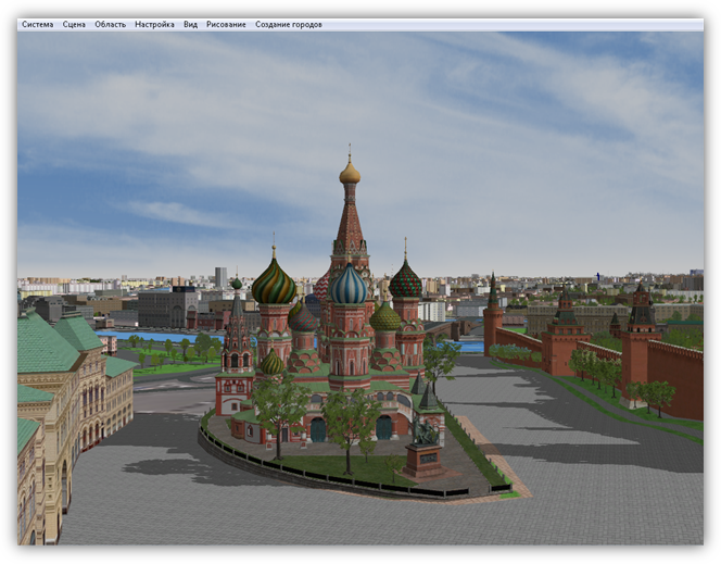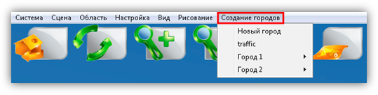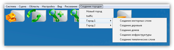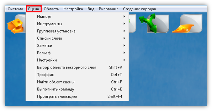 В верхней части главного окна Программы расположено меню, которое содержит разделы «Система», «Сцена», «Область», «Настройка», «Вид», «Рисование», «Создание городов».