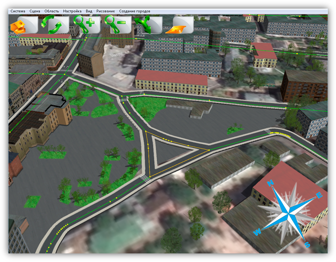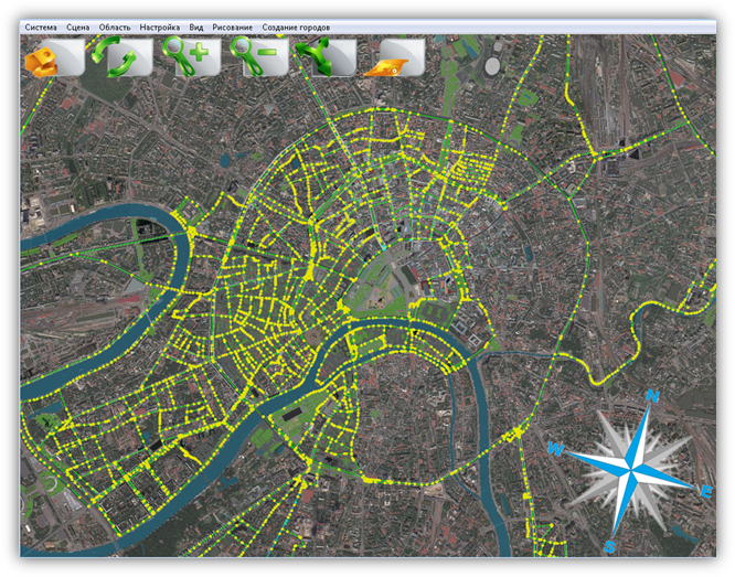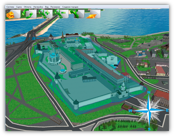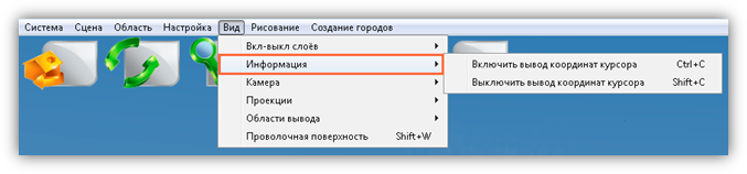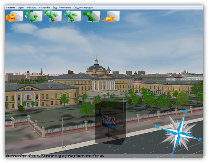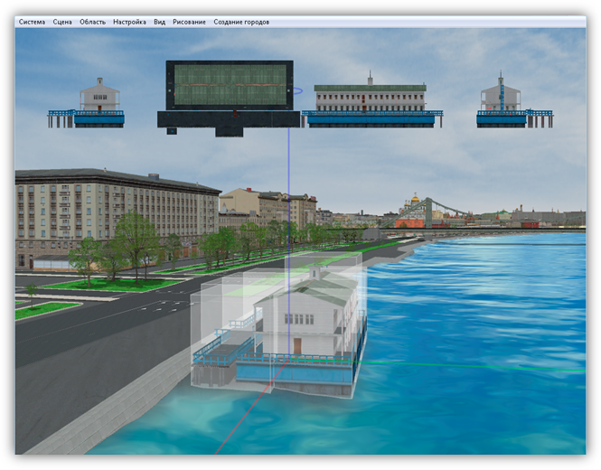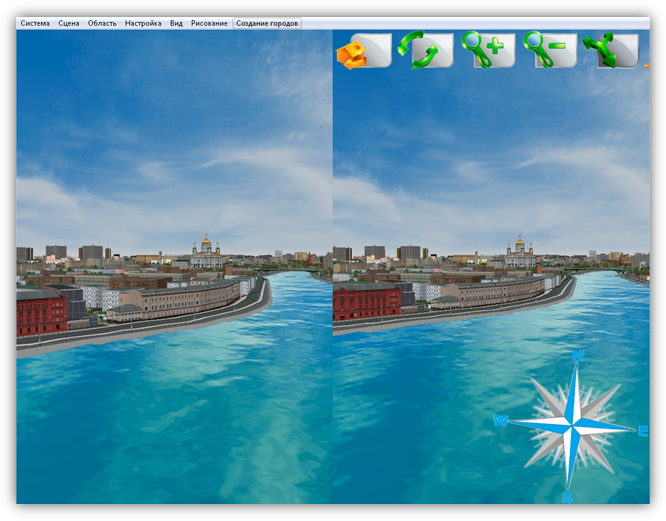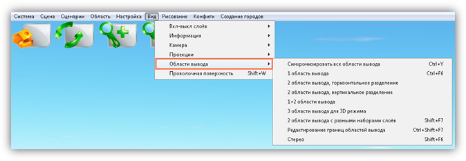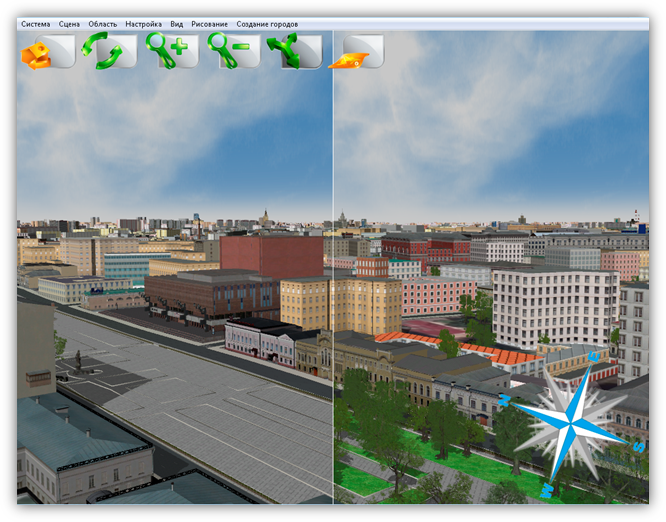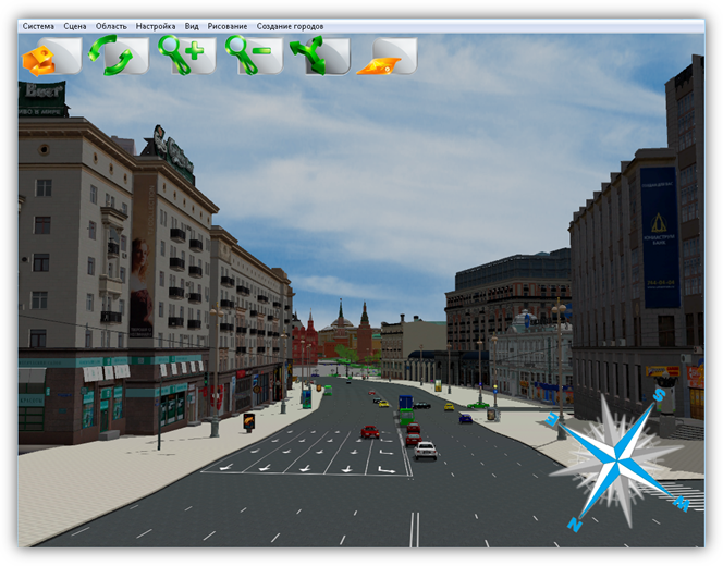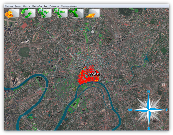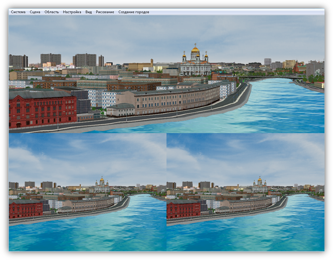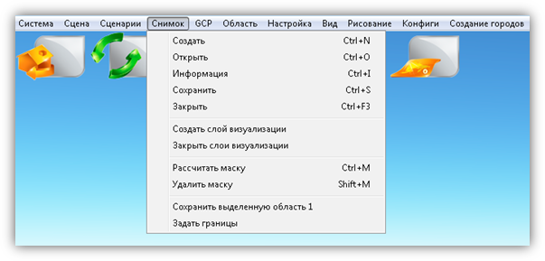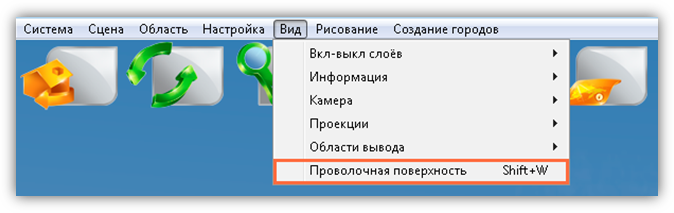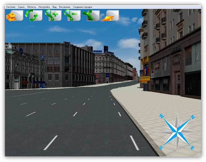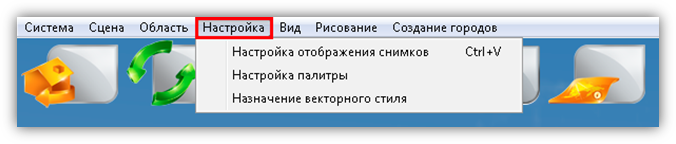 В верхней части главного окна Программы расположено меню, которое содержит разделы «Система», «Сцена», «Область», «Настройка», «Вид», «Рисование», «Создание городов».