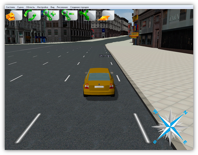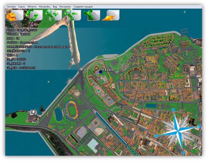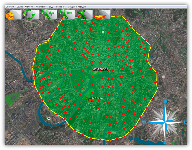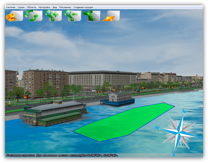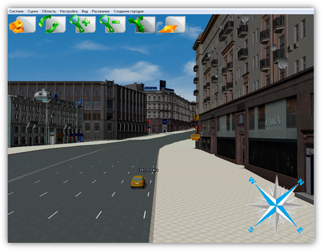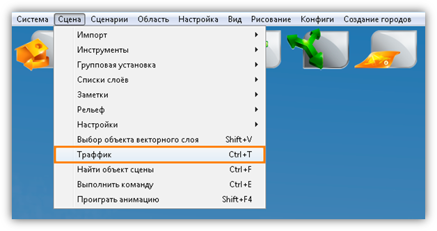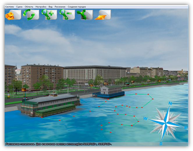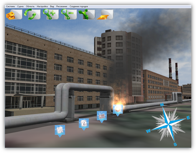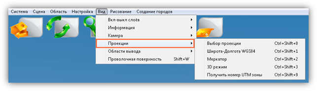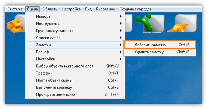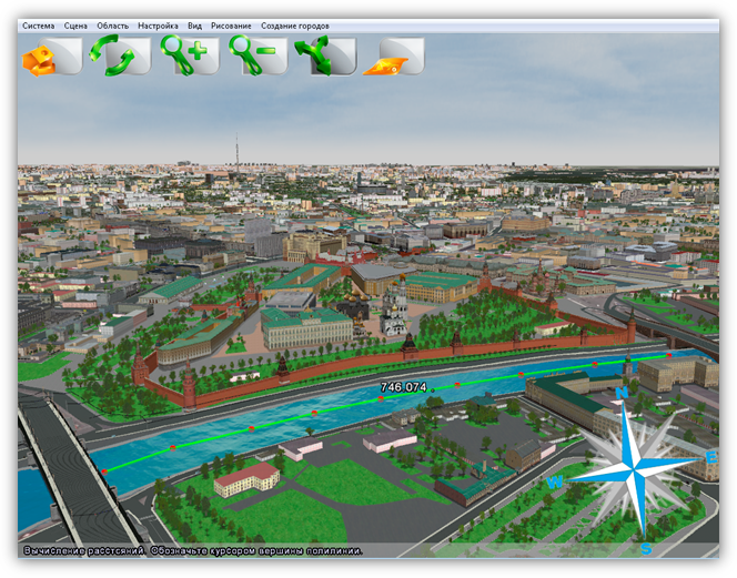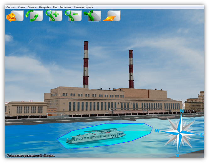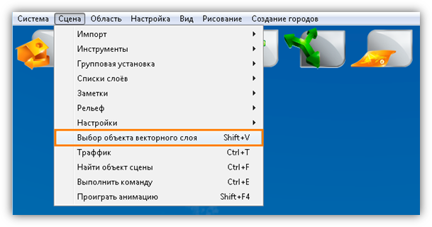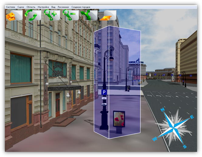 В верхней части главного окна Программы расположено меню, которое содержит разделы «Система», «Сцена», «Область», «Настройка», «Вид», «Рисование», «Создание городов».