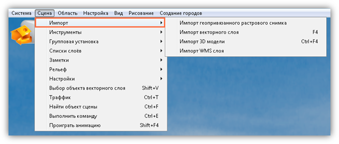 · Пункт «Импорт» (Рисунок 7) предназначен для добавления в сцену новых слоев и объектов, созданных внешними программами, в том числе 3D-моделей, растровых снимков с географической привязкой, векторных слоев, и включает в себя следующие подпункты: