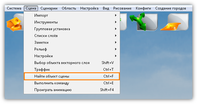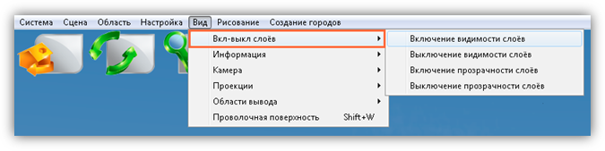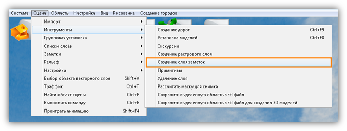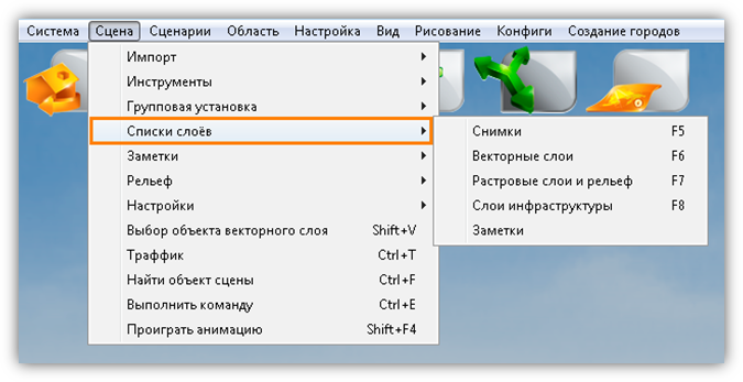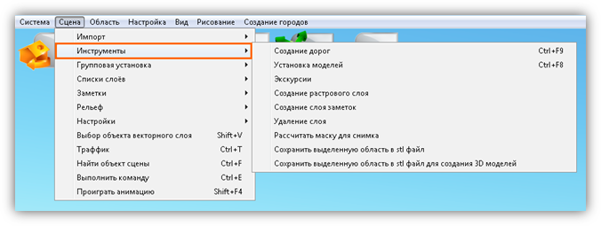 Раздел меню «Сцена» предназначен для работы с объектами и слоями сцены, импорта слоев и объектов из внешних программ, а также для настройки инструментов визуализации и навигации по сцене.