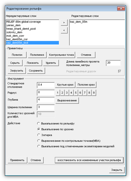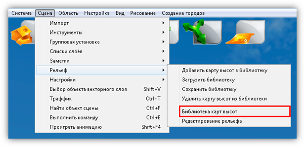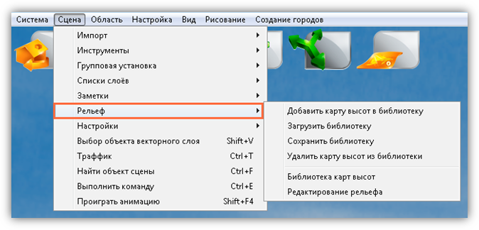 · Пункт «Рельеф» (Рисунок 12) используется для работы с библиотеками карт высот и для редактирования рельефа. Он состоит из следующих подпунктов: