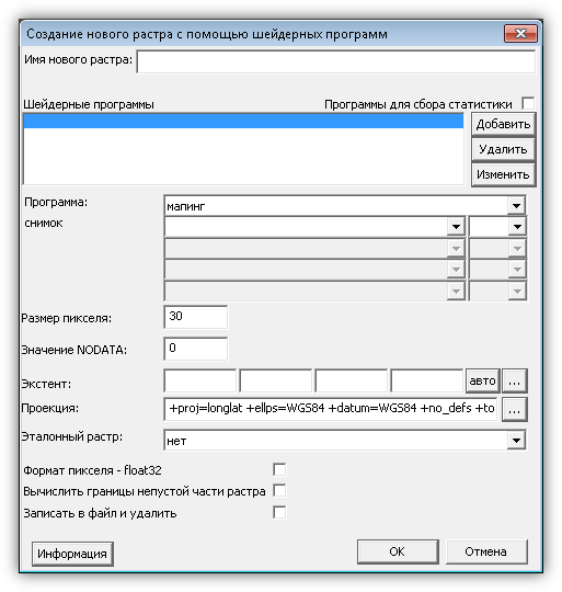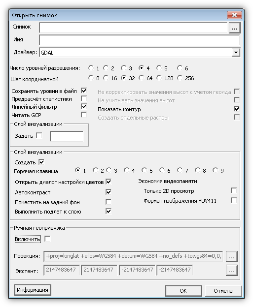 ü Ручная геопривязка – переход в режим ручной привязки. При включении этого флага становятся активными поля, расположенные ниже (проекция и экстент), где можно самостоятельно указать требуемые параметры.