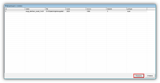 В таблице отражены сведения об идентификаторе слоя, его кратком и полном имени, количестве пикселей по вертикали и горизонтали, количестве каналов и формате пикселя. Если нажать кнопку «Показать» в нижнем правом углу окна, появится сообщение, содержащее расширенную информацию о снимке (Рисунок 149).
